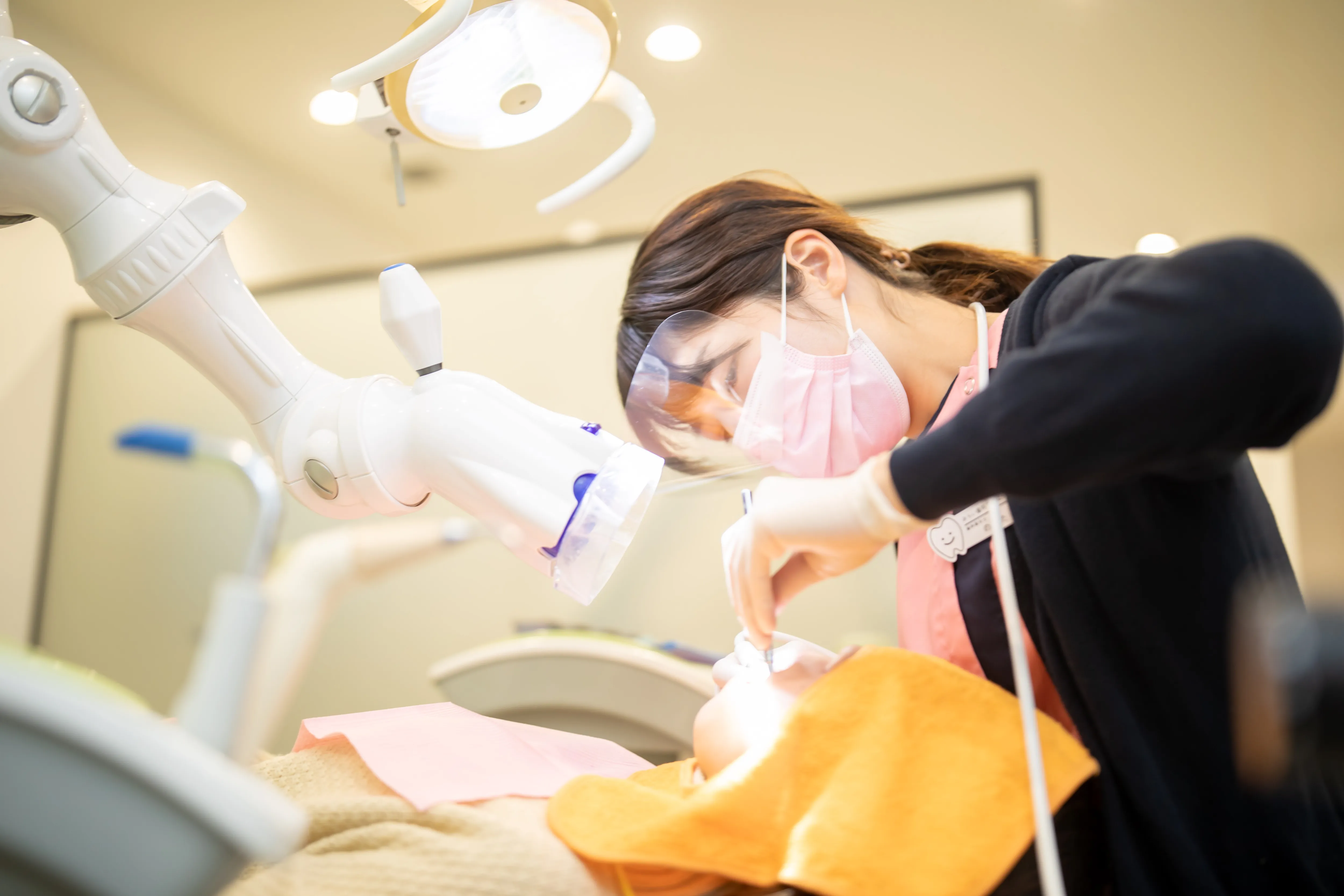 初めての治療に緊張するお子さんには、すぐに治療を始めず「歯医者に慣れる」ことからスタートします。お子さんのペースに合わせて無理なくステップアップできるよう、恐怖心を与えないよう段階を踏み、やさしく声をかけながら進めることで、前向きに通える環境づくりを大切にしています。