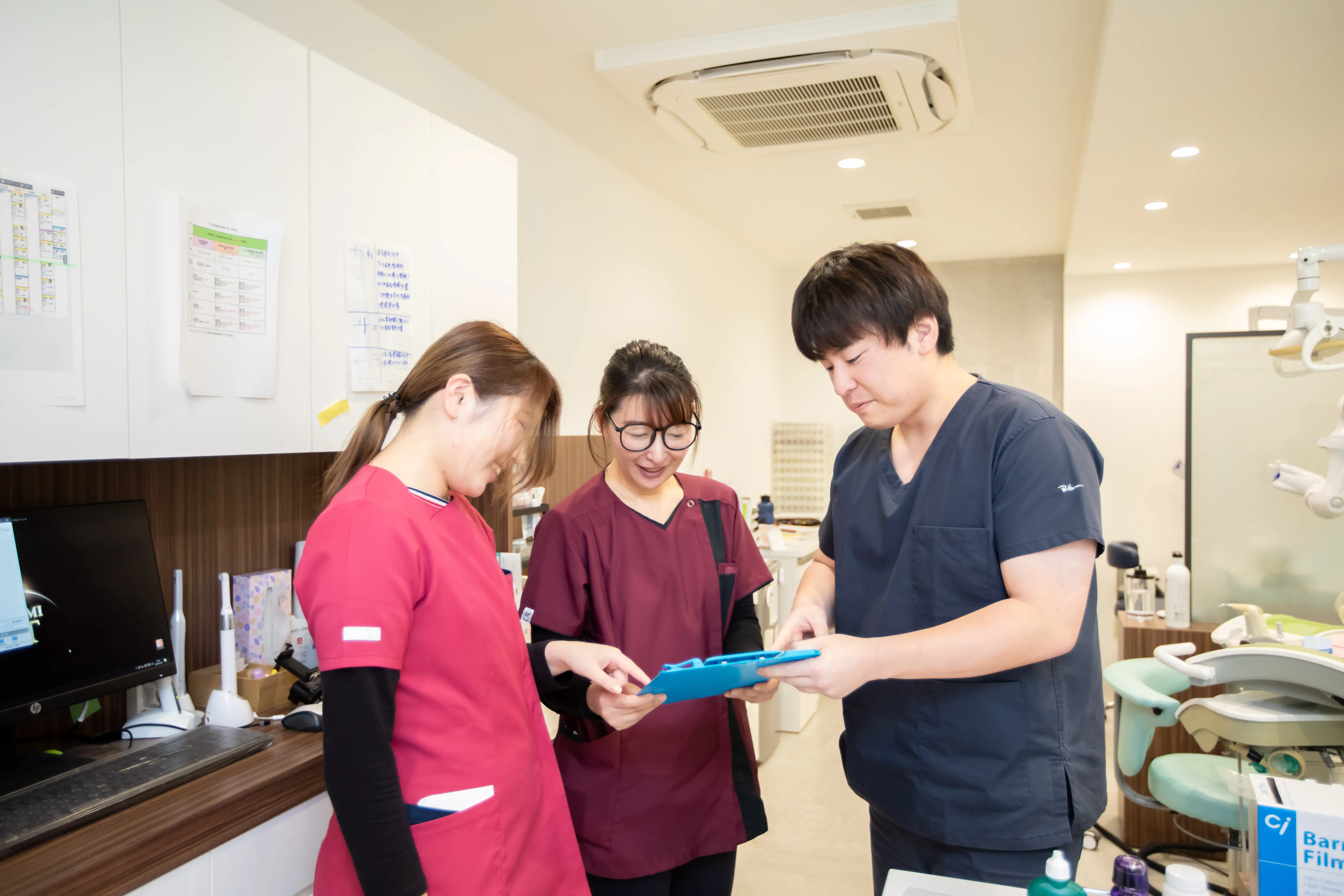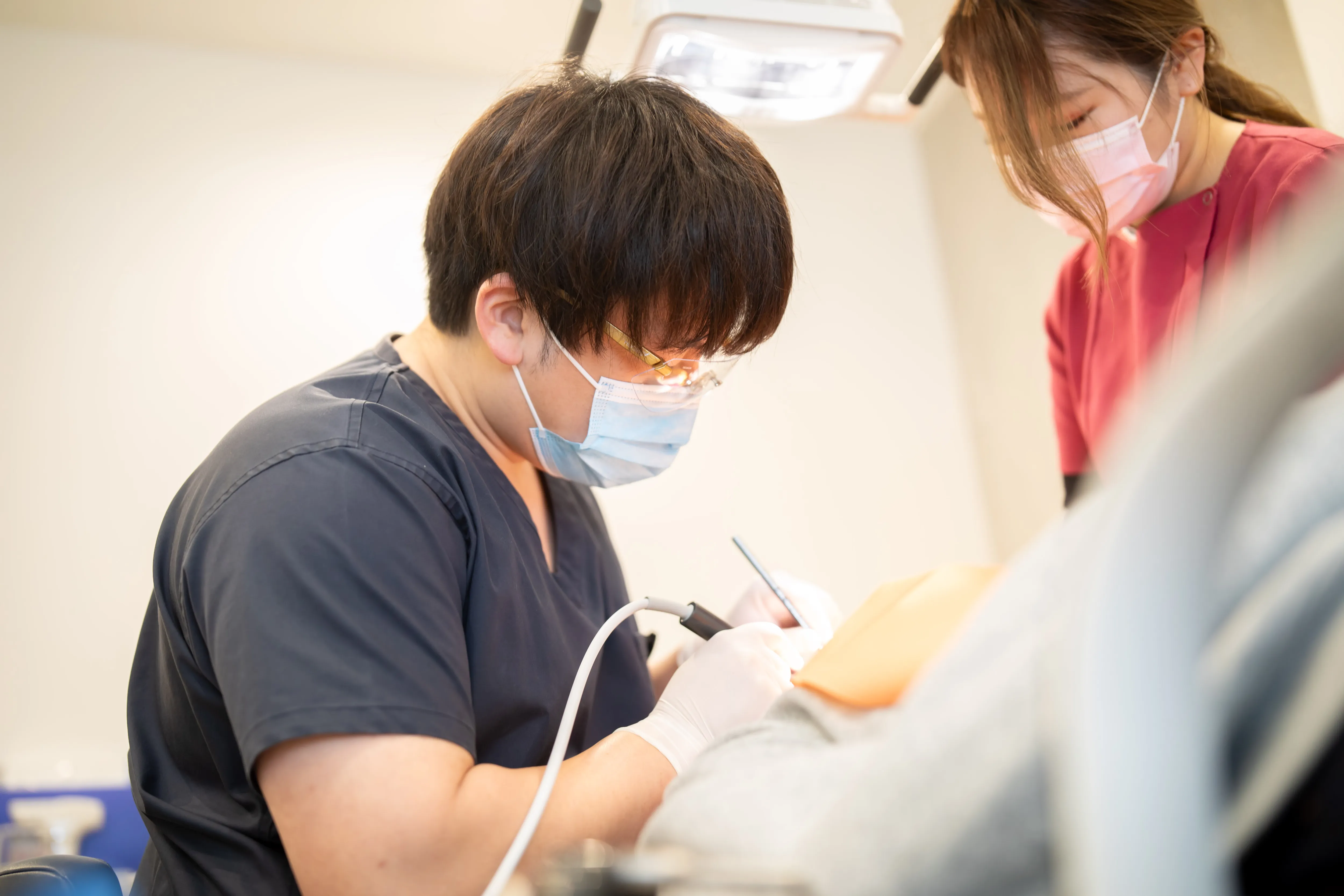 歯科治療に苦手意識を持つ方が多い中で、当院では痛みをできるだけ抑える治療を心がけています。表面麻酔を塗布してから局所麻酔を行い、さらに電動麻酔器を用いることで注射時の圧痛を軽減。麻酔液は人肌に温め、刺激を感じにくいように工夫しています。治療中は患者さんの表情を確認しながら、声をかけ、リラックスして治療を受けられるよう努めています。