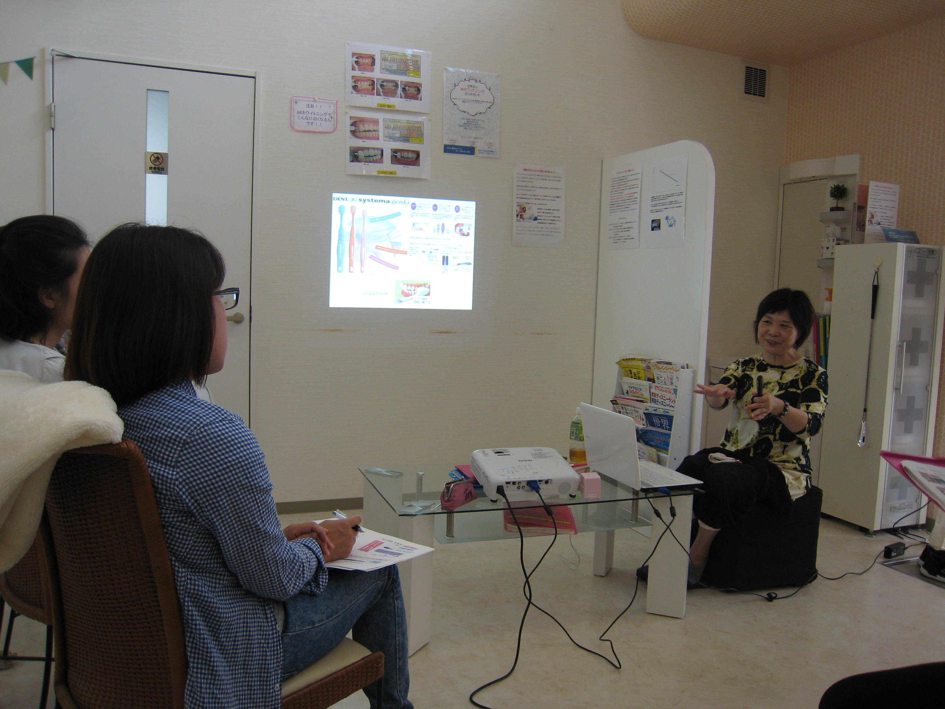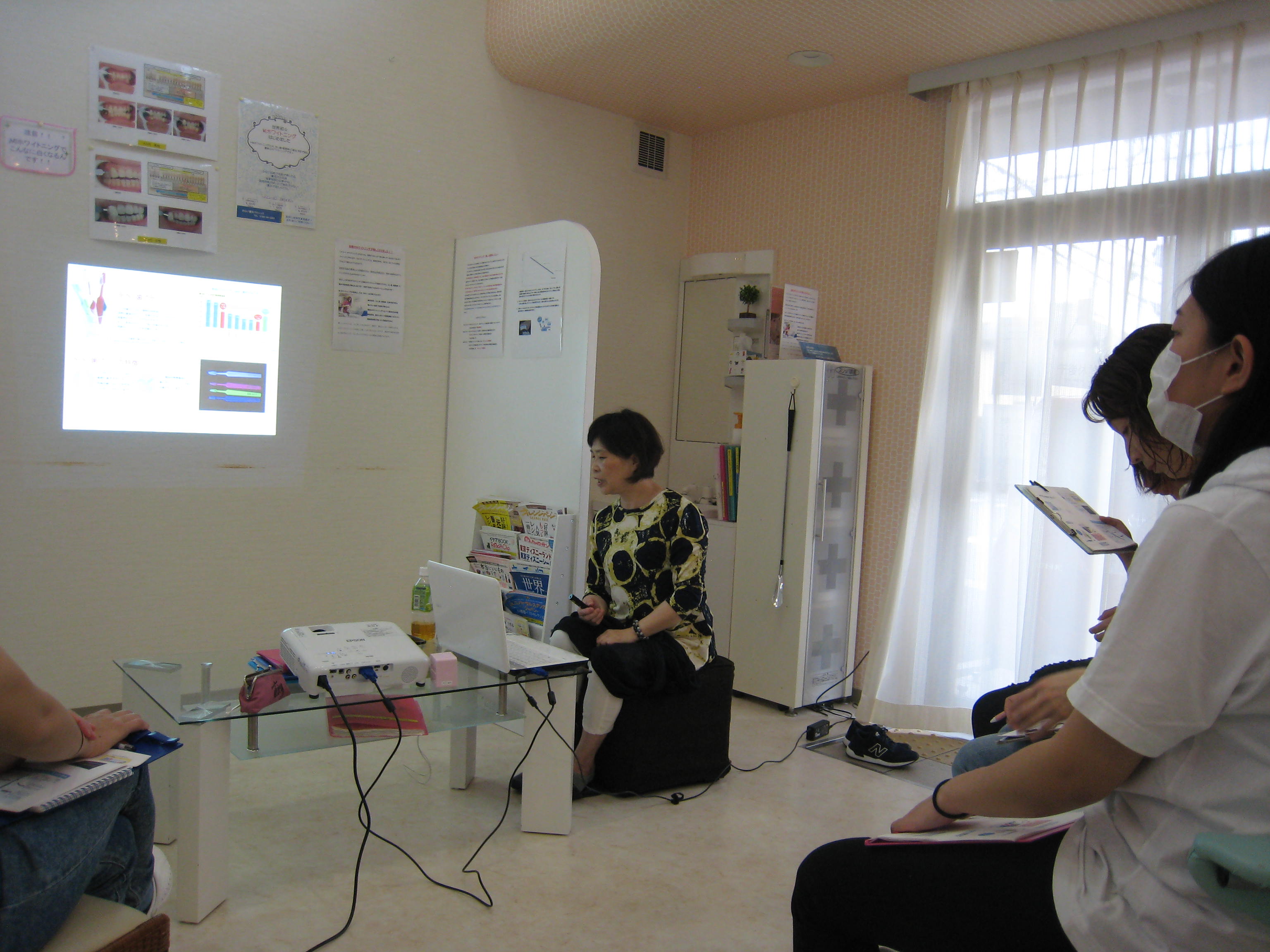 みらい歯科クリニックでは、毎月1回、休診日を利用して院内セミナーおよび勉強会を開催しています。講師にはフリーランス歯科衛生士の堤内久枝先生をお招きし、スタッフ全員が日々の診療に必要な知識を継続して学べる環境づくりに取り組んでいます。