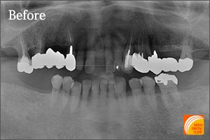 上の歯1本、下の歯2本インプラントを埋入した患者さんです。患者さんのご希望通り、前後の歯を削って歯に負担をかけるブリッジや、違和感があり、こまめな清掃が必要な部分入れ歯を回避できます。
