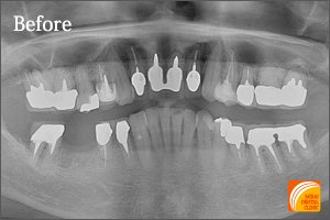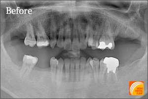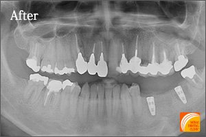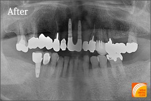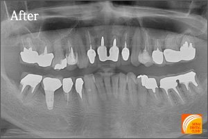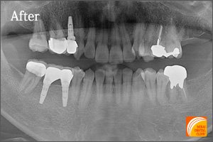 右下奥歯に1本のインプラントを埋入した患者さんです。前後の歯の状態が良くないため普通のブリッジは適応不可でしたが、1本のインプラントを埋入することにより前後の歯の寿命を伸ばすことが可能になります。