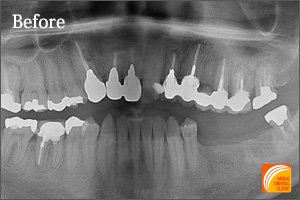 左下奥3本を失われた患者さんです。3本歯がないからといって3本インプラントが必要なわけではありません。2本インプラントを埋入することにより3本の歯を支えるインプラントブリッジにより治療しました。