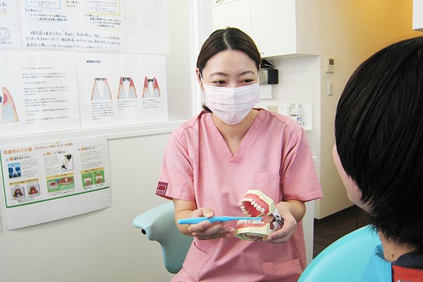 まず気になることなど伺ったあと、口腔内診察を行います。そして歯のクリーニングで歯石を除去しお口の中を徹底的にきれいにします。そのうえで毎日のブラッシングに活かせるように汚れがたまりやすい部位などのみがき方のアドバイスをいたします。