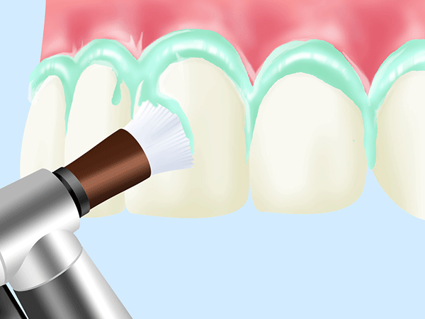 フッ素化合物には歯質を強化してむし歯に対する抵抗力を高めるはたらきが期待できます。また歯の再石灰化を促す効果も期待できるので、フッ素化合物の歯面塗布はむし歯予防につながります。定期的なフッ素塗布がおすすめです。
